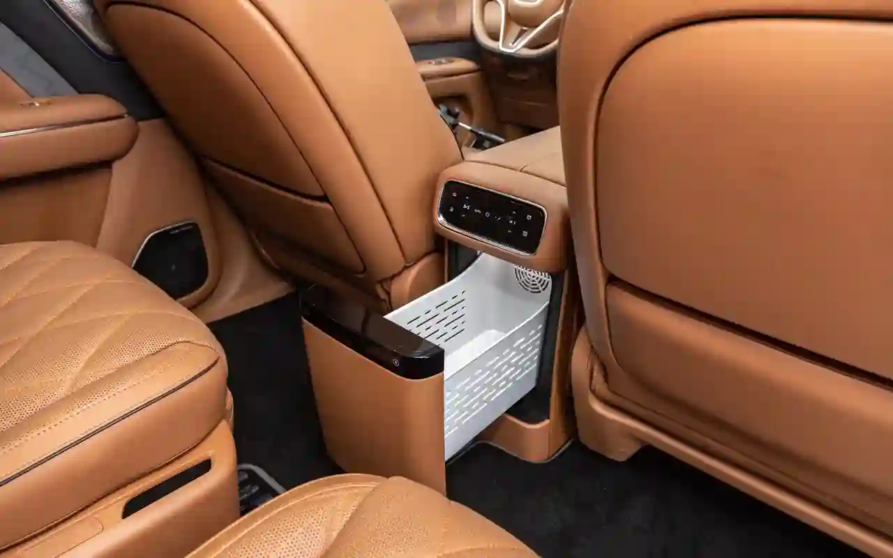 К слову, есть холодильник и портативная «микроволновка». Конечно, шутим, но отчасти. Вместительный отсек под подлокотником водителя не только охлаждает, но и греет: саке или шампанское для вип-пассажира всегда будет правильной кондиции.